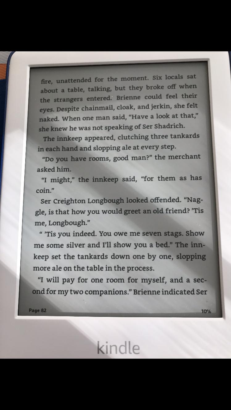 Another thing I’m surprised by is that the recessed screen does not annoy me at all. I thought it would after four years of the Voyage and one and a half of the Oasis. The white surround often makes me feel I am reading a paperback page, as in certain lighting conditions the edges of the page blend into the surround. I also don’t miss having buttons, and I love the buttons on the Oasis.