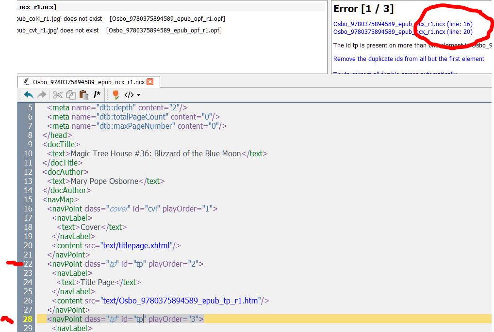 Originally, the reported error lines (16 and 20) don't agree with the actual line numbers (22 and 28) in the ncx (Post #1), but now they do Used the original pre-edit version of the book, I did what I had done, and now the line numbers agree 22=22 and 28=28 Is it possible that somehow I made some changes that affected the NCX and didn't run the check again? If it happens again (and I've seen it before), I'll try to make a good test case |