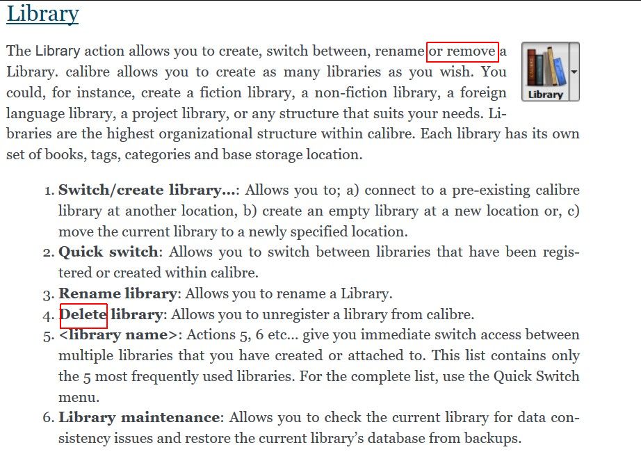 @Kovid - I was questioning the 'Delete', not the 'unregister', the menu has 'Remove' library as does the preceding paragraph