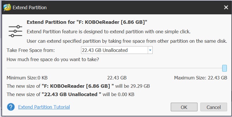First step was to copy the image to the new card. Took a while but I managed to read a few pages while it happened. After the copy, I started PW11 and the drive appeared as in the first image. I then right clicked on the F:KOBOeReader partition and then selected Extend Partition. This brought up the Extend Partition dialogue where I simply moved the slider to the right edge leaving no free space and maximizing the user accessible storage then clicked on OK. At this point, I clicked on Apply which brought up the progress dialogue in the third image. After this completed, I had a card with the partitioning shown in the fourth image. Pretty much exactly what was in the Glo Memory Upgrade Mod Guide thread. |