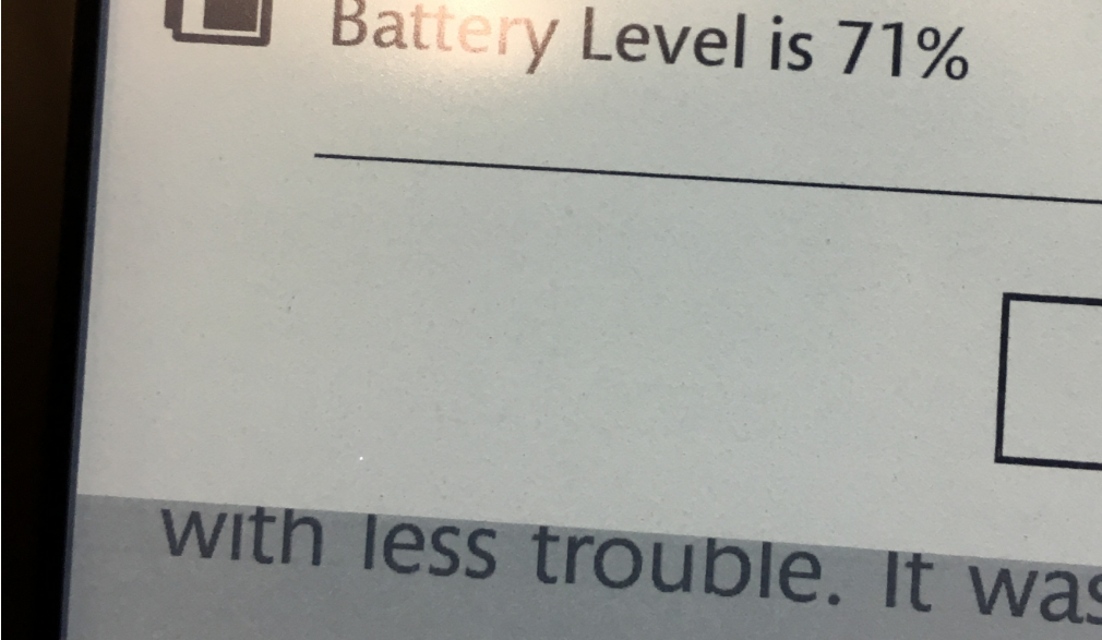 I guess I'll drive over and see if they are starting to get some in stock yet for a replacement. Aside from this issue I'm surprised at how much I like the device so far - finally got around to doing some actual reading on it over the weekend. The size and weight increase aren't a problem for me and I do appreciate the extra space, especially for illustrations (reading a new book about Revolutionary War and the maps are spectacular - which has always been a problem reading military books on previous ereaders). Anyway - here is that picture... (it's right above the word "less") https://imgur.com/a/Q5qDW3V |