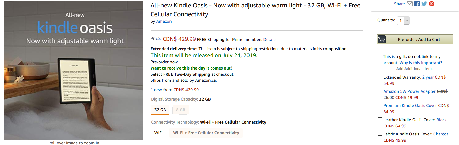 OTOH, even if I select the WiFi and Free Cellular version for the Oasis or the WAN version for the Paperwhite, the tech specs does not mention cellular connectivity for either the Oasis or the Paperwhite. On yet another hand, at least I don't get to see a Special offers variant on Amazon.ca. |
