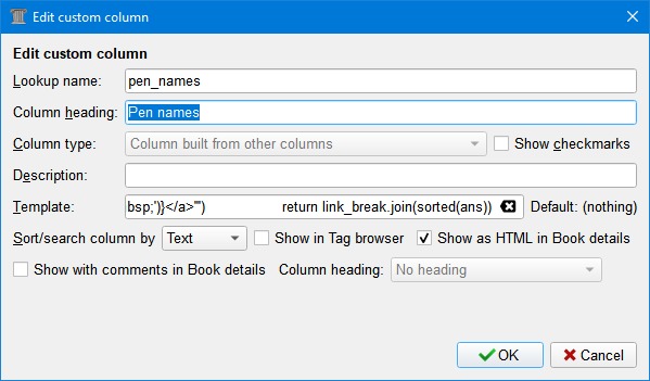 Another way to deal with pen-names might be to put them into a User Category, there's a template function to access UCs. You probably wouldn't want to use UCs for anything but pen-names. You can search on UCs and they appear in the tag browser.BR |