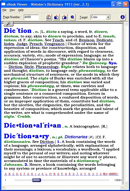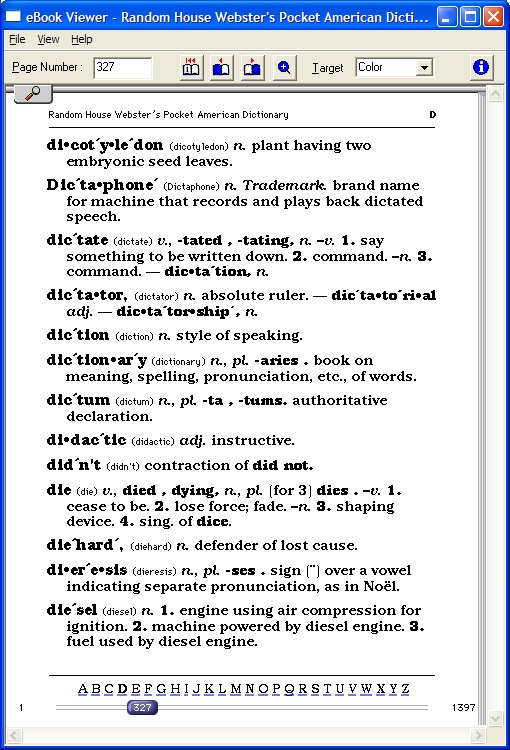 They would be beneficial in Reference-type materials that cover a lot of different topics, i.e. with the current topic in the header. I've also seen an early Random House dictionary for the REB1200 which had the "Letter" of the section being read in the 'header'. Pretty, but not overly useful. ![]() A 'footer' holding a TOC-like index IS quite useful though and is incorporated into my EBW1150/REB1200 Webster's Dictionary (1913). Last edited by nrapallo; 03-09-2009 at 03:31 PM. Reason: added images |