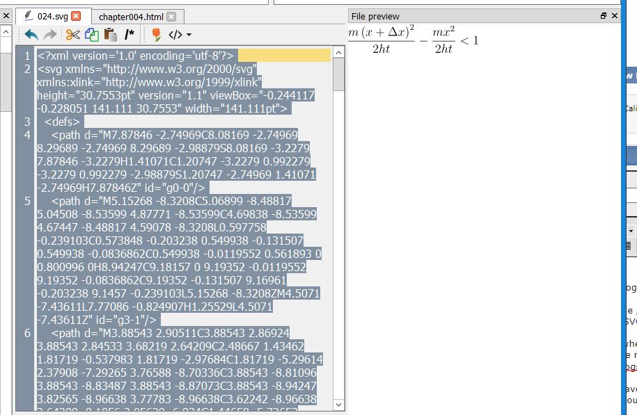 https://www.codecogs.com/latex/eqneditor.php in order to make the LaTeX to replace poor quality JPGs, GIFs, PNGs, etc. of equations with an SVG image. Working well, but when I import the SVG into a epub, I get what looks like a lot of vector paths. The result is good, but if I have to correct something, I have to start over at codecogs. Is there a way to save the SVG differently in the epub-- preferably as the 'raw' LaTeX -- so that I could just paste it into codecogs, fix, and resave? |