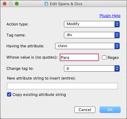 I have an epub that I am looking to fix when I export it to HTMLZ. Currently, it defines the paragraph by a <div> with the class "Para" (short for 'Paragraph'). I am sure that I could just do a search and replace for all div that meet this criteria, just turning <div class="Para"> into <p>, but there are also 'id' tags in the mix, which are used for links. So ideally, I'd like to add a child class to these divs. Here's a quick example: Current Epub: <div id="link001" class="Para"> Let's start off by saying... </div> Current HTMLZ: <div id="link001" class="Para"> Let's start off by saying... </div> Expected HTMLZ: <div id="link001" class="Para"> <p> Let's start off by saying... </p> </div> Is this possible? Thank you! |
