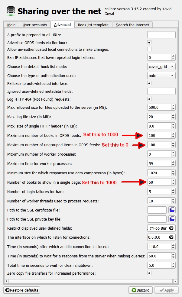 Are you connecting using the content server? YES You say it stops on book #990 in "title view". What does "stop" mean? Is it acting like there are no more books, or is it doing something else? It is acting like there are no more books. What exactly is "title view"? Is it tapping on "By Title"? YES How do you know it is book #990? CC doesn't display a count. Did you actually count them, or are you using desktop calibre to determine the number? Desktop to determine the # Does the same thing happen if you tap "By Newest"? NO it does not What happens if you change the calibre settings to as shown below? Be sure to write down the original values so you can put them back. Changing the settings had no effect. I will send you the debug log in just a minute! THANK YOU SO MUCH for your help!!! |