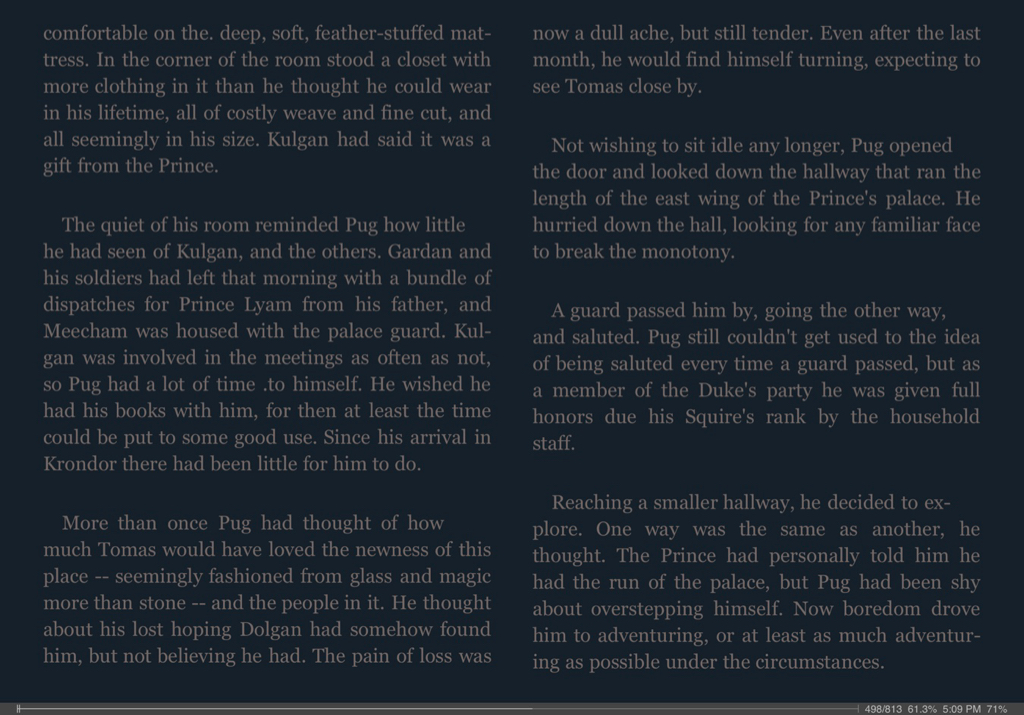 Mine is pretty close to this. I also use FBReader on my Ipad Pro. It syncs up with FBReader on my Samsung S8, so it's a great solution for me. I'll grab a screenshot of mine when I get home (If I remember). What background and fonts are you using? I like to tinker, so I might try your combination and see how I like it, too.