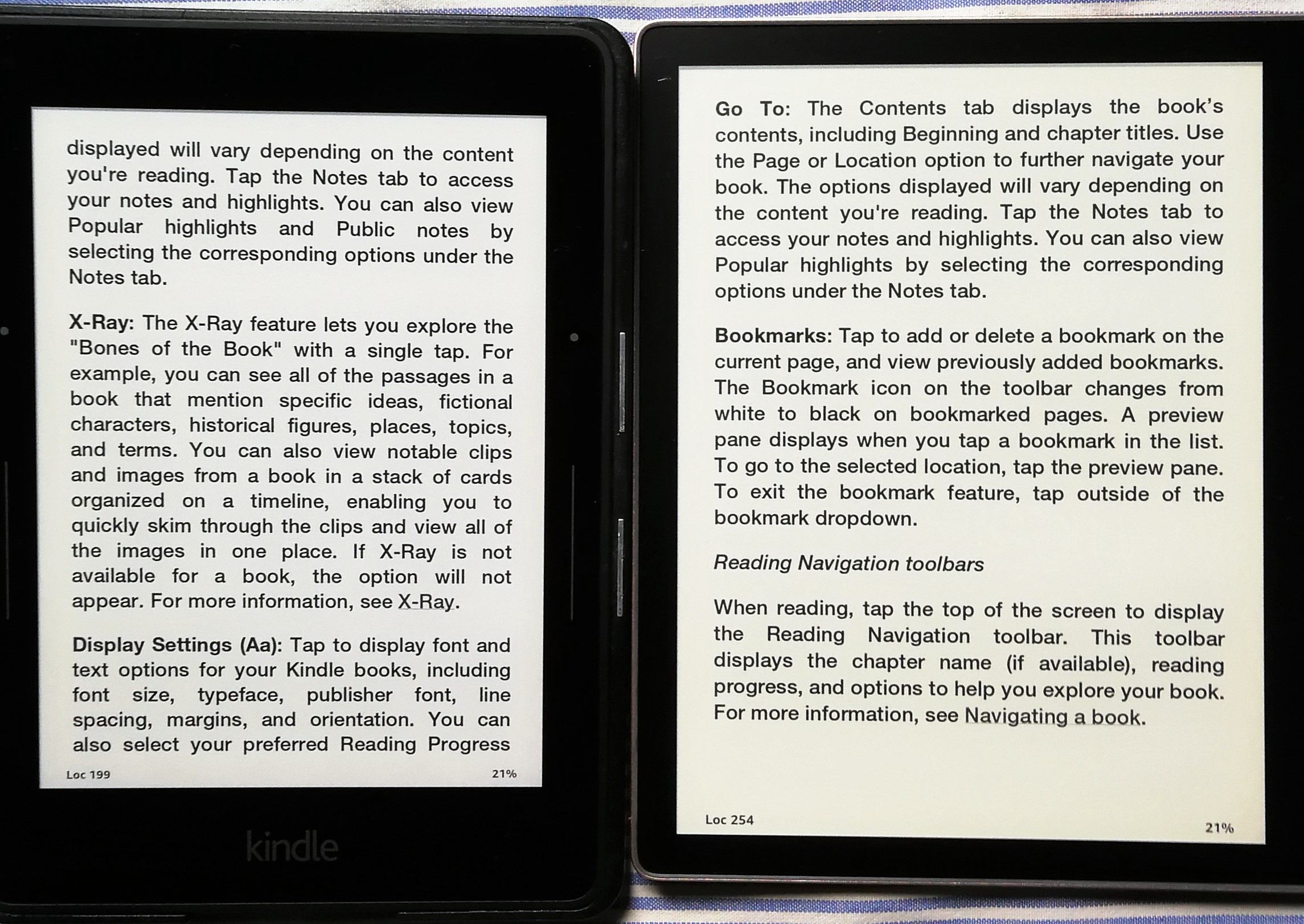 Anywho, I only compared a wee bit yesterday between the 2 and the voyage and O1. And I agree with the comments and photos posted. Although my O2 was never as warm as compared to the Voyage. It was closer in my case. I don't notice much difference with the O3 in bright daylight as I don't have the light on very high. The warm setting is depending on how high the light is set so in bright light at light #8, its just barely warm. Looks great though. Very even. Most even lit kindle yet. I shines when inside and less bright light as far as the warm setting goes. I am still playing with the settings to find my spot. I also found the font either darker just a tad as the O2, or the contrast. Or maybe its the backround, I can't say. All I know that side by side with same light level, the O3 was easier to read. I don't think though unless holding them next to each other it would be noticable while reading. My O2 had a fine screen. But the warmer tone does seem nicer on the eye in inside, not much bright light conditions. Is it faster? I can't tell. To be fair though its a new device and doesn't have as many books on it or has been used for a long time so I expect it to be faster just based on that. |