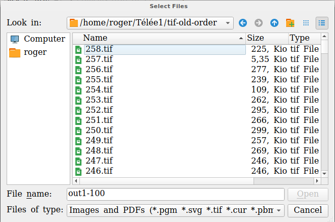 I have a book that needs to be recognized. It consists of 258 pages, numbered from 001.tif to 258.tif. I use gimagereader-qt (a front-end for Tesseract) to recognize them. Unhappily, the files imported and displayed on gimagereader are set in reverse order (from 258 to 001). (see screenshot)Yes it's a bug and I have no solution for it. The processing thus begins with 258. Moving the files manually in the display is too tedious. Except if I batch rename the files in reverse order. Thus 001 would become 258, 002 > 257 and so on. gprename allows to use a regular expression... |