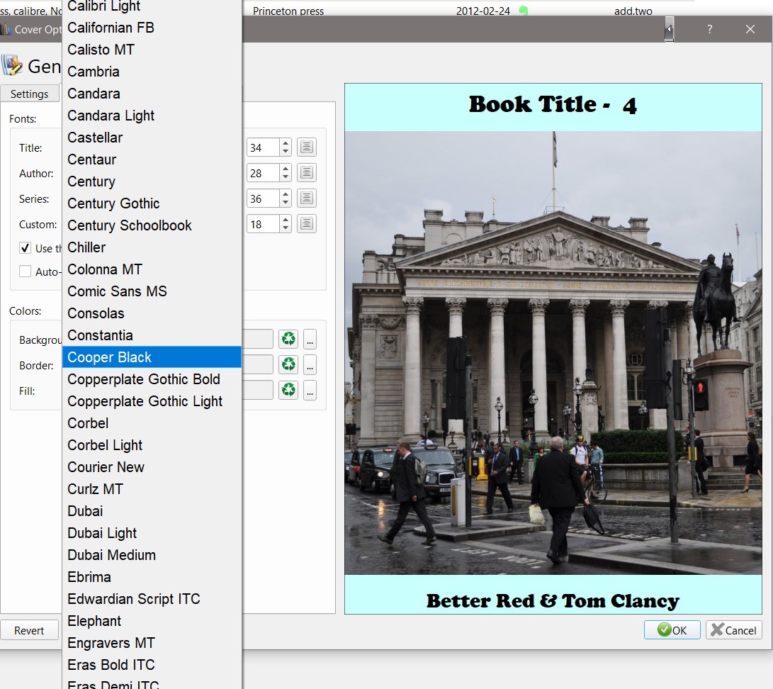 I was able to fix the problem by adding the front in the edit metadata/generate cover section. Once I added the font family in the calibre generate cover settings the plugin version is now able to see the Cooper fonts ( I have both Cooper Black and Cooper Black Italic). Not sure why the main calibre program saw the font & the built-in generate cover didn't. I'm just glad adding the font to the built-in version also added it to the plugin version. |