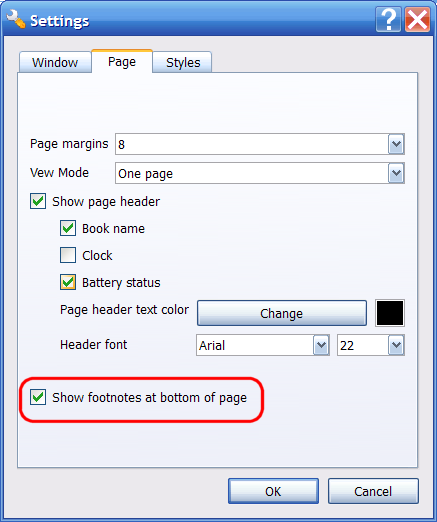 http://e-ink-reader.ru/coolreader_en.php and this one too: https://wiki.mobileread.com/wiki/Cool_Reader EDIT: Of course, first you must enable the feature: and then select as "View Mode" (Settings.../Page tab) "One page" or "Two pages" (not "Scroll View"). After that, you'll see footnotes as the following picture: Last edited by RbnJrg; 03-08-2016 at 09:21 PM. |