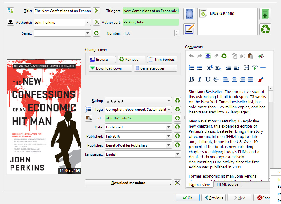 @tomx - if you can post screen shots of the Metadata edit screen to that John Perkins book and your Preferences->Send to Device and Preferences->Save to disk settings, someone will help you figure out why you have the title_sort value (articles at end) in the file name and not the raw title value.