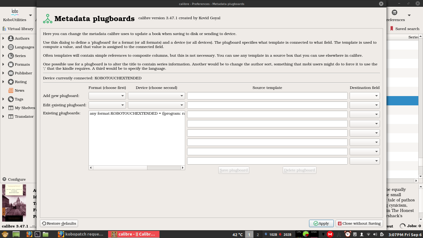 e.g. if you're using the KoboTouchExtended driver: Format: any format Device: KOBOTOUCHEXTENDED Source template: Code: