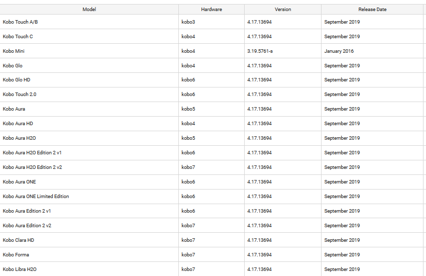 Kobo firmware 4.17.13694 has been released. As of September 19, 2019, it has been released to the Kobo Touch A/B, Kobo Touch C, Kobo Glo, Kobo Glo HD, Kobo Touch 2.0, Kobo Aura, Kobo Aura HD, Kobo Aura H2O, Kobo Aura H2O Edition 2 v1, Kobo Aura H2O Edition 2 v2, Kobo Aura ONE, Kobo Aura ONE Limited Edition, Kobo Aura Edition 2 v1, Kobo Aura Edition 2 v2, Kobo Clara HD, Kobo Forma, and the Kobo Libra H2O. It has not been released to the Kobo Mini. The affiliates used to check these firmware versions were: kobo, bestbuyca, fnac, beta, rakutenbooks, and the walmartca. Download Links Official Links: