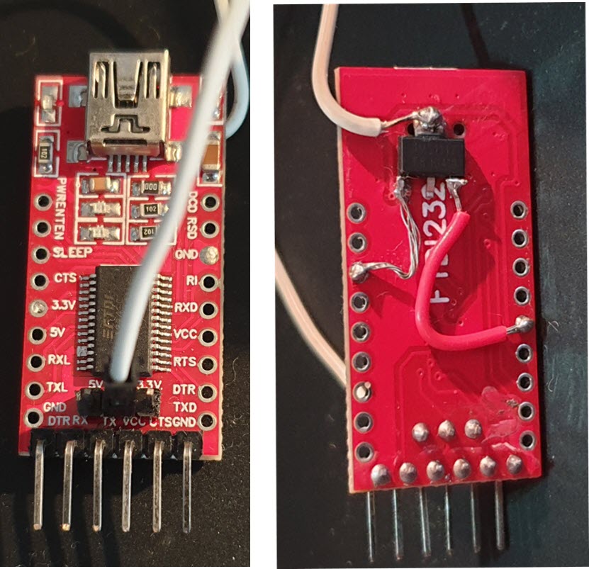 I have something i got some time back, it's a red board with 5 pins sticking out and no jumper, so i guess i need to solder RX TX GND?