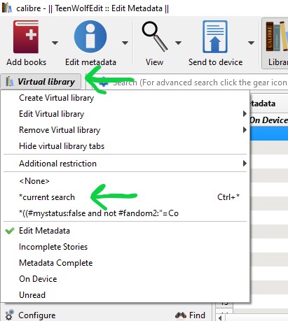 I frequently use virtual libraries to narrow down the books I need to search through. And you don't need to create permanent vl's to do so. Let's say you're looking for, idk, a Fantasy book that has unicorns in it. You've tagged your books with the Fantasy tag but not unicorns but you know they're mentioned in the book summary. Do a search however you normally would for the Fantasy tag then click on the Virtual Library to the left of the search box and then select *current search. See the image attached. This restricts the searchable books to just the ones marked Fantasy while allowing you to conduct new simple searches. Otherwise you'd have to create a search something like: tags:"=Fantasy" and unicorns You can also just keep hitting *current search as you narrow down the field. It might get a little unwieldy depending on far you're drilling down but it is doable. |