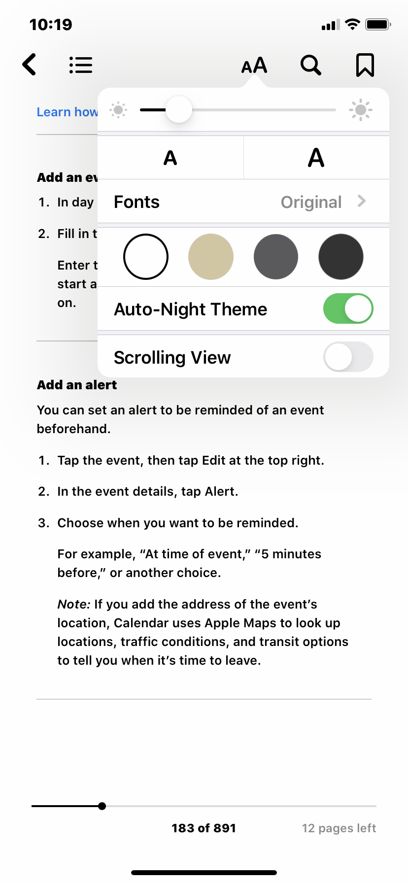 Meanwhile, in using the solution in cgsmom's post, did you make sure to select a color other than black when selecting the Book's Auto-Night Theme option. If you select any color, including whit, it should use that when the option is toggled on, therefore overriding any other settings. (I think...) See screen capture attached. ETA: Auto-Night Theme option only applies to the book being read, not the entire Book app interface. Dark Mode applies to the Book app interface and the whole iOS iPadOS interface but can be overridden inside the Book app for books, but not PDFs. So you can actually have a Dark Book app interface with white book pages. If you want white for the Book app interface and for the book pages then you need to Turn Dark Mode off in the iOS/iPadOS Settings app and make sure to either turn off Auto-Night Theme within the Book app or at least set it too white pages. Apple made this über complicated. ..... Last edited by OtinG; 10-01-2019 at 12:52 PM. |