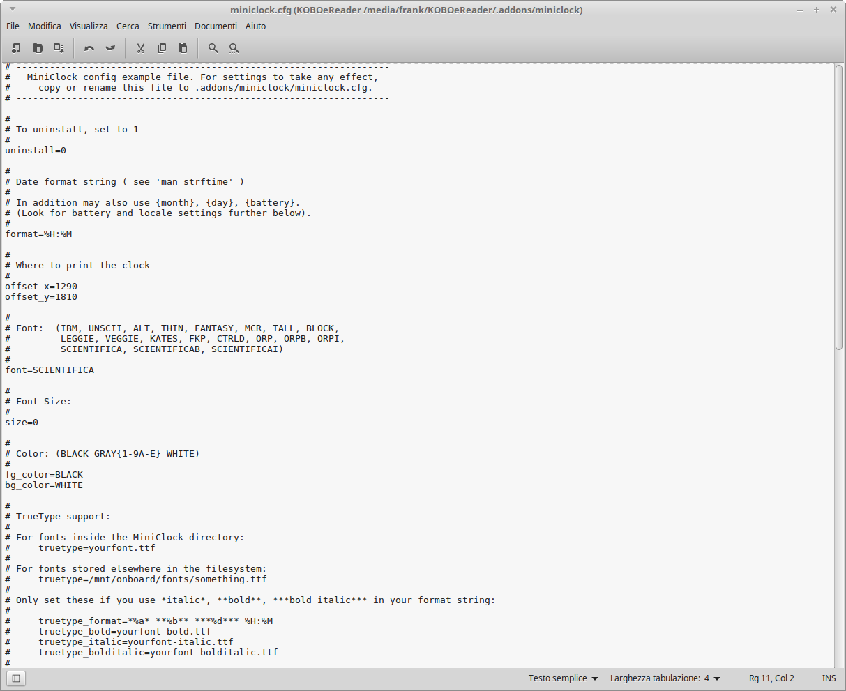 truetype=dejavu_sans.ttf truetype_size=8 truetype_x=5 truetype_y=10 (And I uploaded the DevaVu Sans font in the MiniClock folder, as it's not provided by default.) It puts the clock in the top left. Always wanted a feature like that. I also like the fact that the clock can be configured in 24-hour format, independent from the reader. (It sets the clock to a format belonging to the language you choose; in my case, it gets set to AM/PM because I use the reader in English.) Maybe I'll reposition the clock to the lower left or right corner, but I don't know yet. I also installed two patches: reduce header and footer height (they're huge, by default, especially the footer), and "increase kepub chapter progression chart". Last edited by Katsunami; 09-28-2019 at 01:23 PM. |
