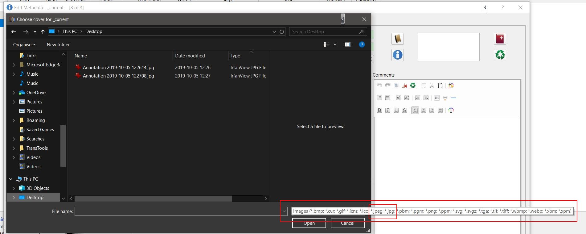No change. I then uninstalled Calibre 4.0 and rebooted the computer then did a fresh install. Still no change. By the way this is what I see when I try to manually set the cover: |