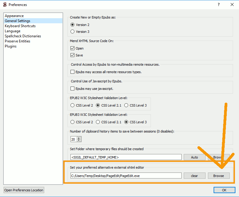 Quote: 4. Open Sigil, and go to Edit > Preferences > General Settings. At the very bottom, you should see a box that says "Set your preferred alternative external xhtml editor".