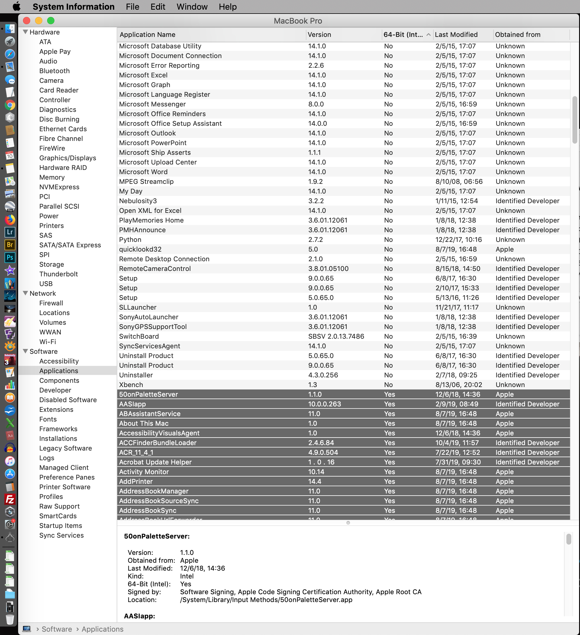 Adobe 32-bit files seem to be mostly connected with the older stand-alone apps like Photoshop CS6 and Lightroom 6. I certainly hope my Adobe CC will work correctly if I upgrade to Catalina. Surely Adobe has upgraded everything necessary to work in 64-bit environment. I checked and the PS CS6 app is 64-bit. But another thing to research before deciding on whether to upgrade. I use the CC subscription, but I keep the PS CS6 and LR 6 apps just in case Adobe raises the subscription rates too high. Apple has quite a few 32-bit apps. I assume those go away and/or get replaced with Catalina. One would hope anyway. Microsoft has nearly as many 32-bit apps as Adobe, but they are mostly connected to the old Office for Mac 2011 I’ve got installed. That is the latest Office I’ve got. I only use the Excel app, so I need to transition into OpenOffice and Numbers. I’m and old Excel user from way back, so I really don’t want to, but I see no other choice if I upgrade to Catalina. I’ve installed Office for Mac 2011 on my Mac mini running High Sierra so I will still have that capability if I want to use it. The Sony 32-bit apps are all related to the PlayMemories Home apps that accompany my Sony cameras. I have installed these on my Mac mini now. I rarely use them. Sony posted a notice that basically said they have no intention of EVER releasing them as 64-bit and therefore they are discontinuing them after March 2020. Thanks Sony, you bleeping bleeps! Oh well not really that big of a deal since I rarely use them anyway and there are 3rd party apps that do what they do. Most of the rest of the 32-bit apps except for Nebulosity 3.x were apps I rarely used and don’t need, so they got deleted from my MacBook Pro and the ones I use and want got installed on my Mac mini so I can use them them on it. BTW, I found the freeware app EasyFind (see App Store) to be very useful in tracking down a lot of these 32-bit apps that were not located in the Application folder. I got the file name from the About This Mac --> System Reports --> Applications report, then entered it in EasyFind and it found where they were. I then deleted the ones I wanted to get rid of. Still not sure if I'll upgrade to Catalina, but it was good to go through and delete a lot of the old 32-bit stuff I don’t need or want. I’ve been needed to do that bit of housekeeping for a long time! One of the Catalina features I was a little interested in won’t work with my MacBook Pro 2014. Although my iPad Pro qualifies to work as a secondary screen, Apple chose to exclude my MacBook Pro model from the list of qualifying Macs, so I’m pretty much SOL with that feature.
