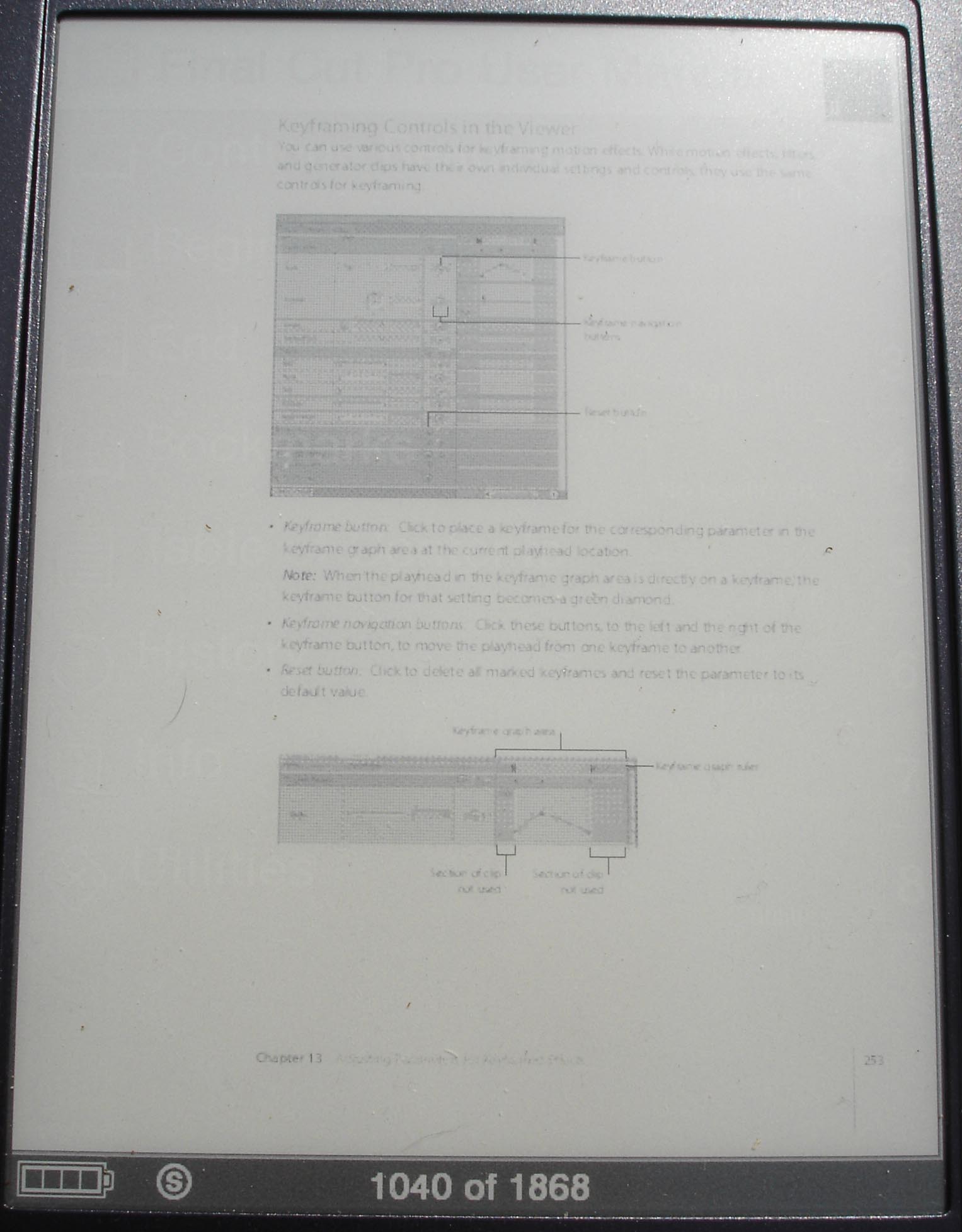 two fairly large manuals - a DVD Studio Pro User Manual (12 M) - and the Final Cut Pro User Manual (42 M). This are rather elegant manuals - page size is 7.5 x 9 inches but I suppose meant mostly to be viewed at a terminal. They zoom all the way to 400% while maintaining their crisp look. They loaded OK from a SD card to the Sony reader, and page turning was reasonable once opened. The larger could take up to 45 seconds or so to load and maybe 30 seconds or so to exit - I suppose the closing time was caused by the updates to cache.xml. On the Sony reader the pages looked "washed out", i.e. type seemed less than black, but of course the type size was very small. In landscape view they could at least be read but they were still washed out. They might load quicker once the cache is updated. Not quite good enough to be useful but almost. Note that they are apparently ver 1.5 PDF's not necessarily supported by Sony. I did two pages - 443 of the DVD Manual and 1040 of the Final Cut Manual (Page III-253 - absolute page 1040). For comparison I also loaded page 1040 to the Iliad. The Iliad does not yet have a landscape mode. However the display is larger and it handles big PDB's without difficulty. The page is also washed out on the Iliad but not as badly. It's readable but small - tantalizing close to being really useful. The Sony reader pictures show both portrait and landscape views - the two landscape views are combined. The pictures are fairly high resolution jpegs - 200 - 300 K taken outdoors in full sun - Not too big I hope. By the way none of the pages I looked at caused trouble - all viewed OK. Note the highlighted line on page 443. This is an active link on the Sony - links are not implemented on the Iliad. |