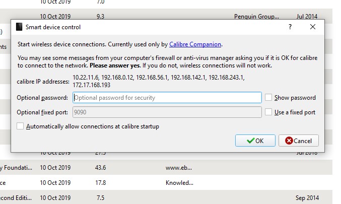 I started "wireless device connections" in Calibre(the software not the app) and tapped connect "as wireless device" in the Calibre companion app on my kindle but the calibre companion app fails to connect every time I try to form a wireless connection. I did not have this problem until I updated the Calibre software on my computer. Can someone assist me and did anyone else run into this problem after the most recent update.