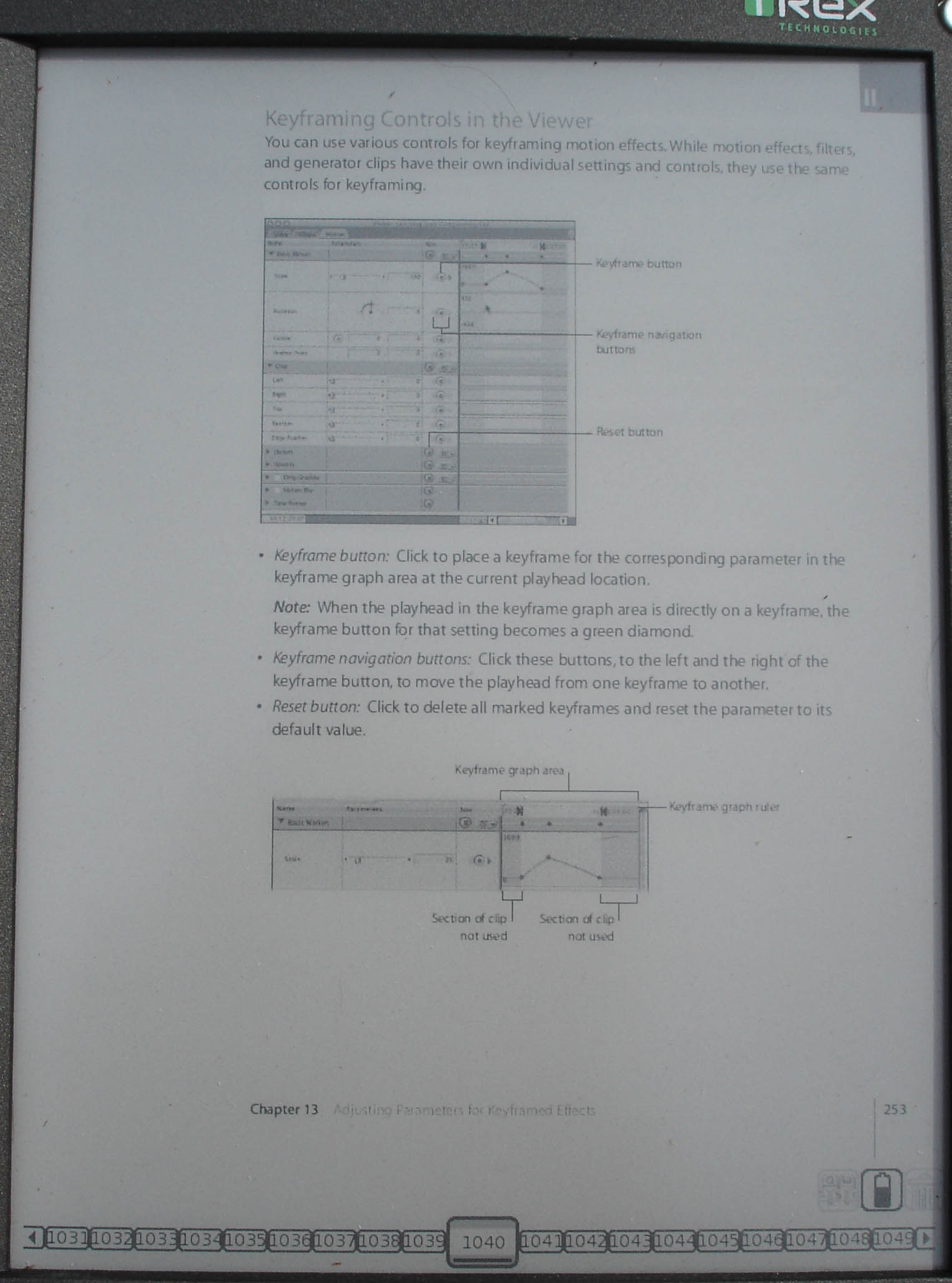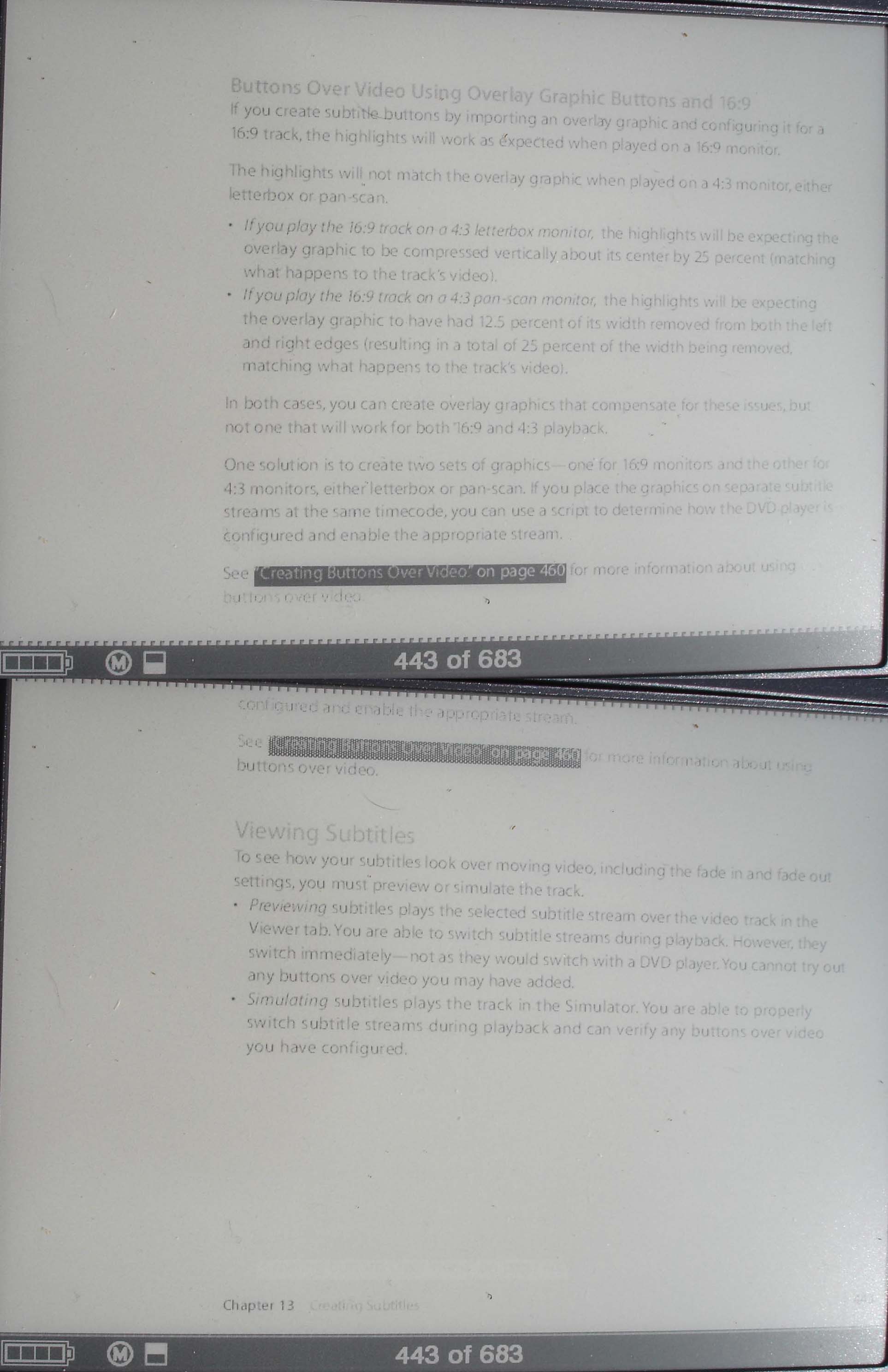 two fairly large manuals - a DVD Studio Pro User Manual (12 M) - and the Final Cut Pro User Manual (42 M). This are rather elegant manuals - page size is 7.5 x 9 inches but I suppose meant mostly to be viewed at a terminal. They zoom all the way to 400% while maintaining their crisp look. They loaded OK from a SD card to the Sony reader, and page turning was reasonable once opened. The larger could take up to 45 seconds or so to load and maybe 30 seconds or so to exit - I suppose the closing time was caused by the updates to cache.xml. On the Sony reader the pages looked "washed out", i.e. type seemed less than black, but of course the type size was very small. In landscape view they could at least be read but they were still washed out. They might load quicker once the cache is updated. Not quite good enough to be useful but almost. Note that they are apparently ver 1.5 PDF's not necessarily supported by Sony. I did two pages - 443 of the DVD Manual and 1040 of the Final Cut Manual (Page III-253 - absolute page 1040). For comparison I also loaded page 1040 to the Iliad. The Iliad does not yet have a landscape mode. However the display is larger and it handles big PDB's without difficulty. The page is also washed out on the Iliad but not as badly. It's readable but small - tantalizing close to being really useful. The Sony reader pictures show both portrait and landscape views - the two landscape views are combined. The pictures are fairly high resolution jpegs - 200 - 300 K taken outdoors in full sun - Not too big I hope. By the way none of the pages I looked at caused trouble - all viewed OK. Note the highlighted line on page 443. This is an active link on the Sony - links are not implemented on the Iliad. |