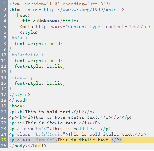 <p><b>This is bold text.</b></p> <p><b><i>This is bold italic text.</i></b></p> <p><i>This is italic text.</i></P> Code: