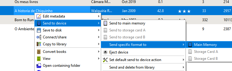 - If book with PDF and CBZ file = Using the "Send to device - Send specific format" = No error given, the file simple do not show in the menu to send file to (just the PDF format)