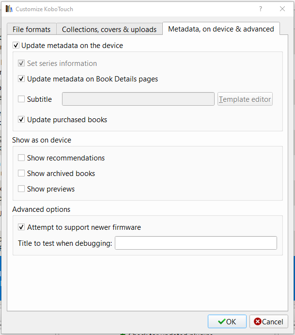 you EJECT so the Kobo PROCESSES what you sent (watch the screen when you Eject) (and unplug so the computer detects the device has disconnected) Once the Home screen shows, Plug it back in. The Kobo driver in Calibre should send the metadata (I can use the Update Metadata item on the Kobo Utilities Icon to force this. REMEMBER, this only works on the Later connections. |