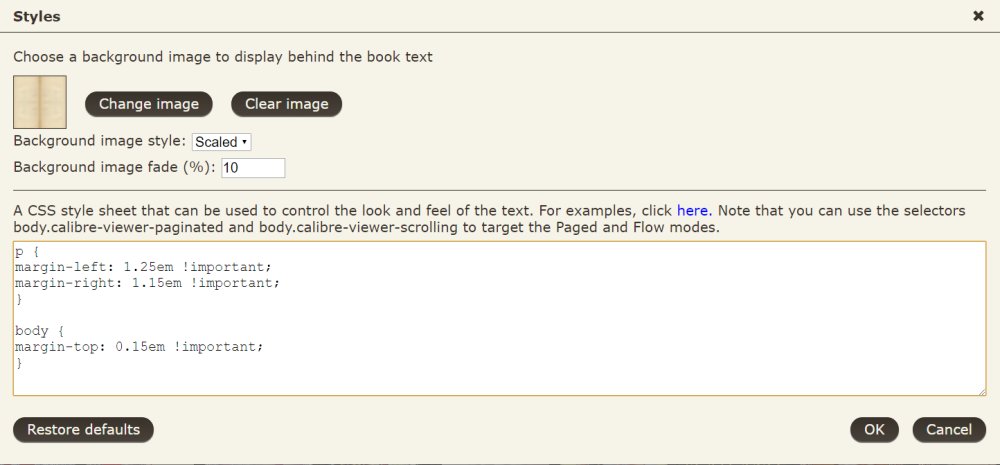 With the viewer changed to version 4+ my css for the viewer and the background changed. I now use the below CSS and the attached background (also attached final result). In landscape mode, 2 pages per screen for reading on my computer. I use the sections in the viewer preferences to set margins, colors, fonts etc. Since I do set a margin in preferences, I set my color scheme to #dbcba7 and set my background image fade to about 10-30%. Code: