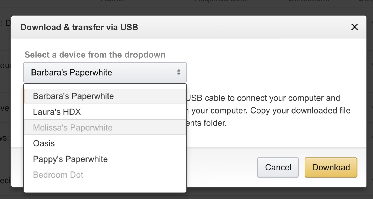 As long as you have a device that can use that method, an actual Kindle device or a Fire tablet, that option is available in Content & Devices. Selecting that option does send the book to the download folder on your computer, and has nothing to do with the Kindle PC app. You don't get the option for iDevices or the Kindle for PC/Mac. Here is a screen grab showing the option for a cookbook on my account. It's interesting that my Paperwhite, the newest version, isn't compatible, but the older Paperwhite, my husbands is a 2nd gen, is, as well as the older HDX Fire my DIL uses. Last edited by Deskisamess; 11-14-2019 at 11:56 AM. |