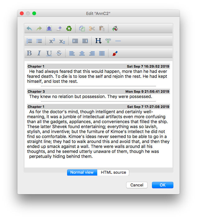 Having said that, I have considered an option to replace the annotations. My main use of annotations is to mark errors, or something to look up later. I don't tend to keep them at all. An option to replace rather than merge would work for me. Another way would be to add the annotations to the end of the existing text if what is there cannot be identified. This is what is done if the comments column is used. If the annotations are edited, it could mean they get repeated. The last option is to not update the annotations if there is any question about merging them. Or prompt for what to do, either individually or as list after the first pass of updating. This is probably the most work. |