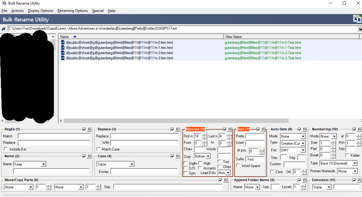 Side-by-side Before/Afters would be nice. As an example, I use Bulk Rename Utility: and it shows any files that are being changed as green. And any options that are going to be applied with an orange box. * * * I think having a Default/Advanced Mode for Sigil's Bulk Rename would work. Default would be similar to how it is now, except you get a few extra "basic options":