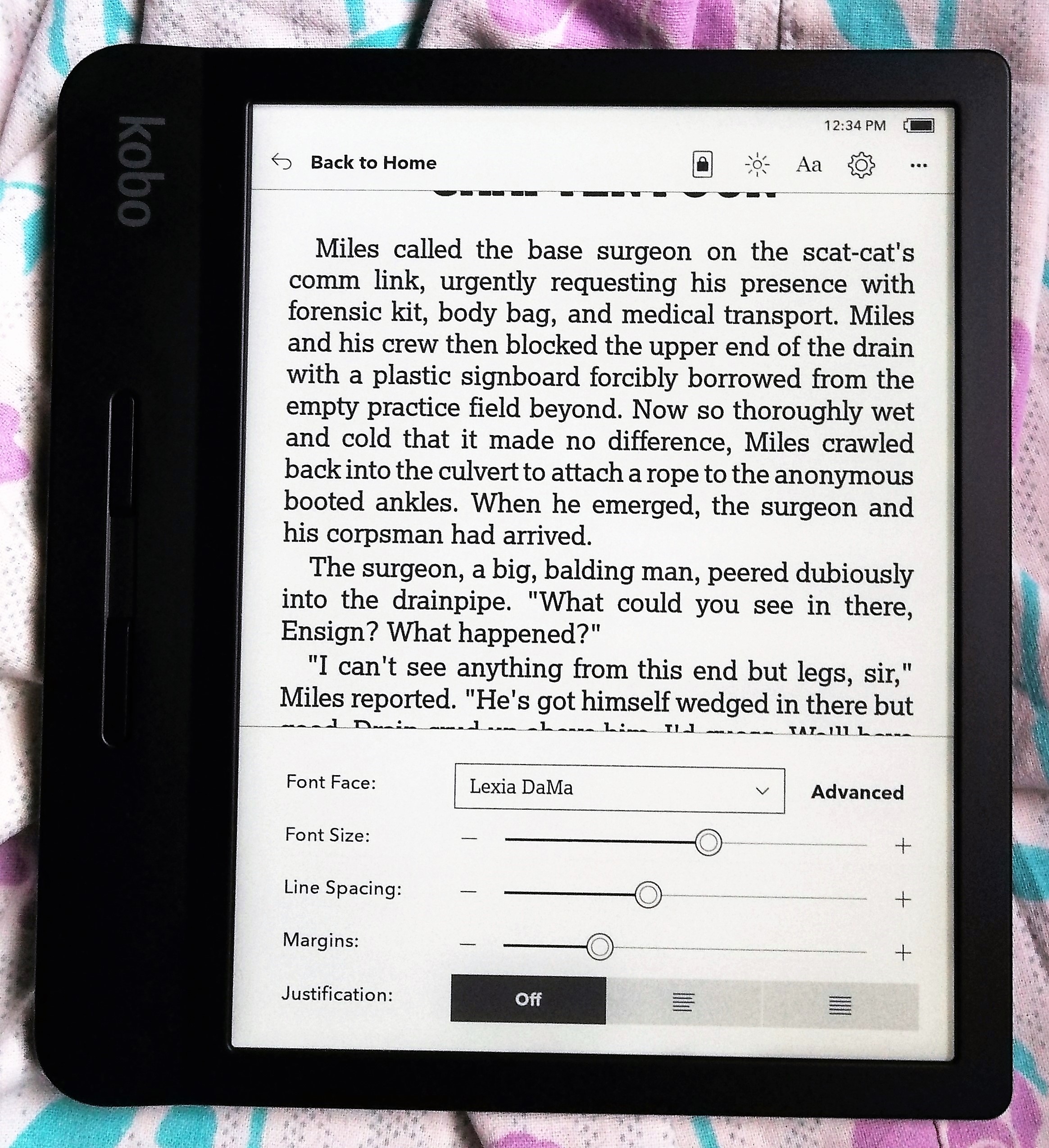 It's another font that looks very good at small font sizes, even though I prefer Literata because it's more compact. By the way, when I mean 'small size' I mean something that is much smaller than the Kindle's smallest setting (and its lack of formatting options is probably the main reason I wouldn't be able to switch).Here are some photos of my Libra H2O with my preferred settings, using different fonts (Literata Book, Bitter, ChareInk, Sirba in this order). Sorry for the bad quality & blurriness. |