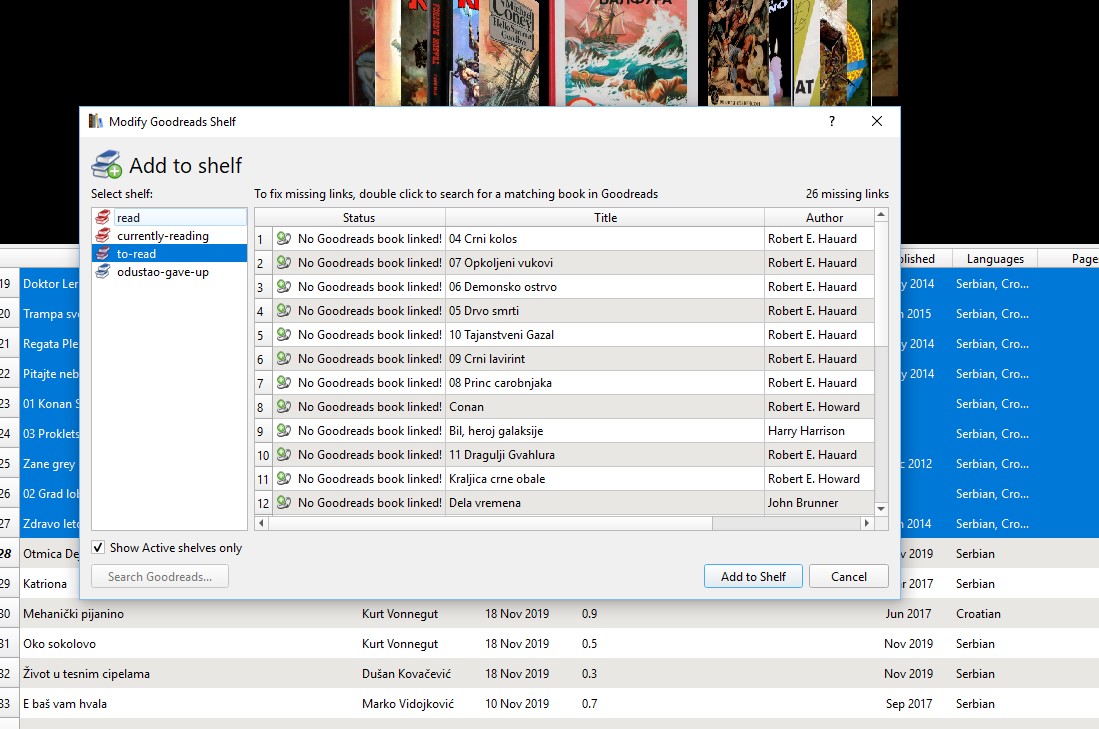 Calibre is unresponsive until I cancel that invisible window by hitting ESC. I don't have any of previous screenshots that will show what I mean when I said that I add multiple books to the shelf. P.S. I tried uninstall/install of GR Sync plugin, but it doesn't help.