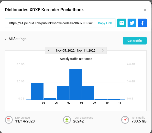 Conversion to dic-format needs a windows program converter.exe and language configuration files. They can be found at the github repository LanguageFilesPocketbookConverter. Nowadays, I am looking into more heuristic approaches to convert free format dictionaries, such as mobi-files and Kindle dictionaries (azw-, azw3-files). Typically it has an intermediate html-stage, which has to be interpreted and converted to the central xdxf-format, before it can be converted to other formats such as Stardict optimized for Koreader, Pocketbook dic-format or mdict-format.* Dictionaries in over 35 languages in both xdxf- (human readable), Stardict- and Pocketbook's dic- (binary) format can be found here. (The xdxf-files can be converted with convert.exe to the dic-files. If you want to tweak your dictionary, this is the place to do it.) 16th November 2021: Getkey just did some testing and the scripting for pocketbook format is updated to handle unicode characters better. All pocketbook dictionaries are recreated. For those that can't be charmed by the tinkerings needed for conversion, post a request and link to your dictionary files and I'll try and convert them. 11th November 2022: Due to an excessive amount of traffic (more than 50GB this month) pCloud is restricting access. As it is a moving total, access should be restored within a few days. (The last 2 days in the graph show restricted access. Apparently, nobody is going to pay for pCloud. )November 13th, 2022: pCloud access is indeed restored. . January 8th, 2024: Link to mirror of the pCloud account on 8th of January '24 Hopefully this will spread the traffic. March 7th, 2024: This one of the links to the 6.5GB stardict-tarball floating around the internet for over a decade. This is the starting place for checking whether a dictionary is available in Stardict format. ___________________________ *Only implemented to check whether there would be a speed improvement over Stardict on Onyx Boox systems. It didn't improve. Last edited by Markismus; 08-24-2025 at 07:21 AM. Reason: Updated the info |