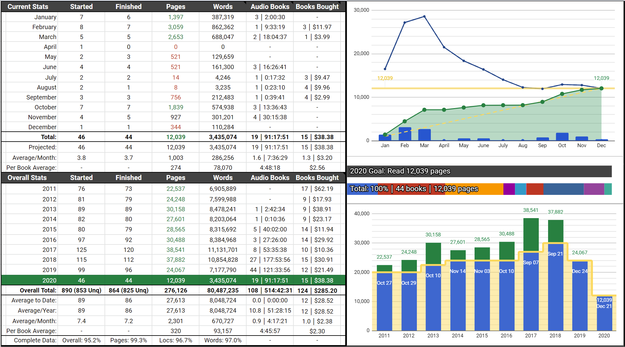 Well, this was certainly a year. I managed to hit my revised goal for the year of 12,000 pages despite dropping it in September. I would have been happy with anything. 2021 here we come!