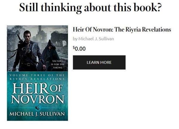 But quite often I get offers that are somewhat strange. Here is an example. The book is Sullivans "Heir Of Novron: The Riyria Revelations" It is the third installment of a trilogy where I have almost finished the first 2. The price of $0.0 is of course tempting so I click, but now the price is $9.39 (including 25% Danish VAT). It is not the first time I experience this and the offer is always the next book in a series that I am reading. Have some of you experienced this? |