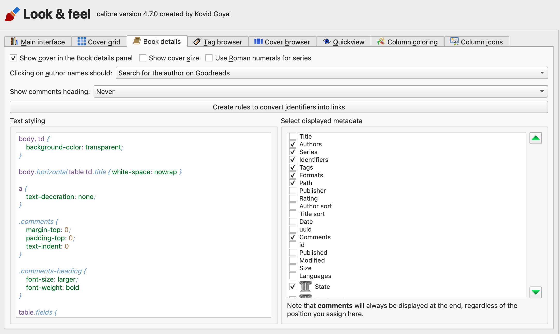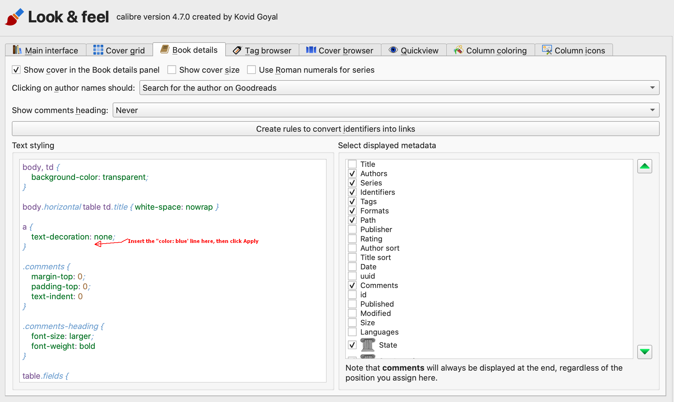 I just installed the latest release and noticed that all the font colors that are hot linked in the book details panel are a light blue. It's a really hard color for me to see so I was wondering how I go about changing it back to what it was. Even in the metadata the comments formatting options are all the blue hued icons.