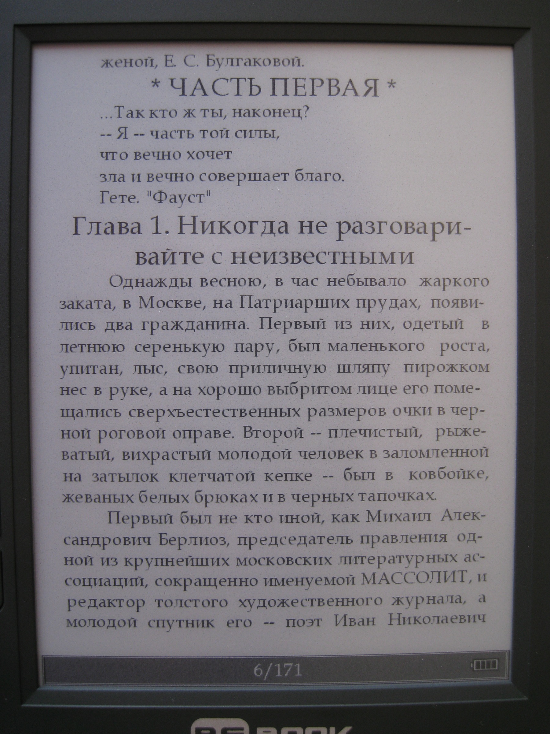Allows user fonts to be loaded on the SD card in a fonts/ folder, so you can load various cyrillic fonts to choose from. Also the language settings allow you to set the device to Russian, so all menus/commands/screens are in Russian. And the BeBook supports FB2 which is popular for Russian eBooks, as well as a multitude of other formats (Mobi, Lit, Txt, Doc, HTML/CHM, PDF, etc.). If you have some docs you'd like tested on the BeBook, upload them and I can display them on my device and take some pics if you want to check out the Russian text. Cheers. |