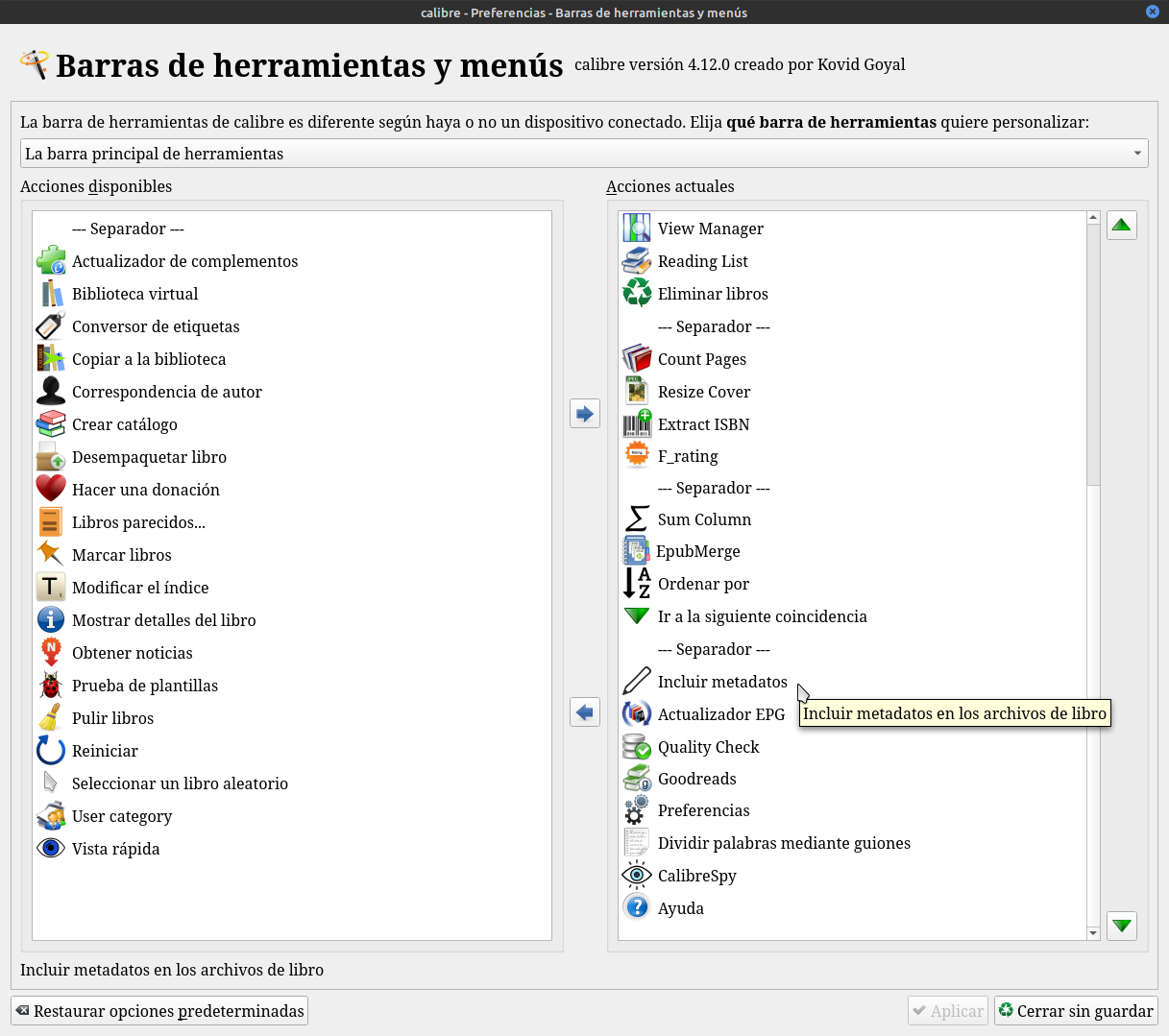 "The icon is a pen, although it is probably a pen. If you don't have it in the toolbar or in the menu, you can add it using the" Toolbars and menu "preferences page. and I found him following his instructions. What it says by displaying the latereal arrow is: Include metadata in book files. And Include metadata in the archives of a specific format of the selected books. |