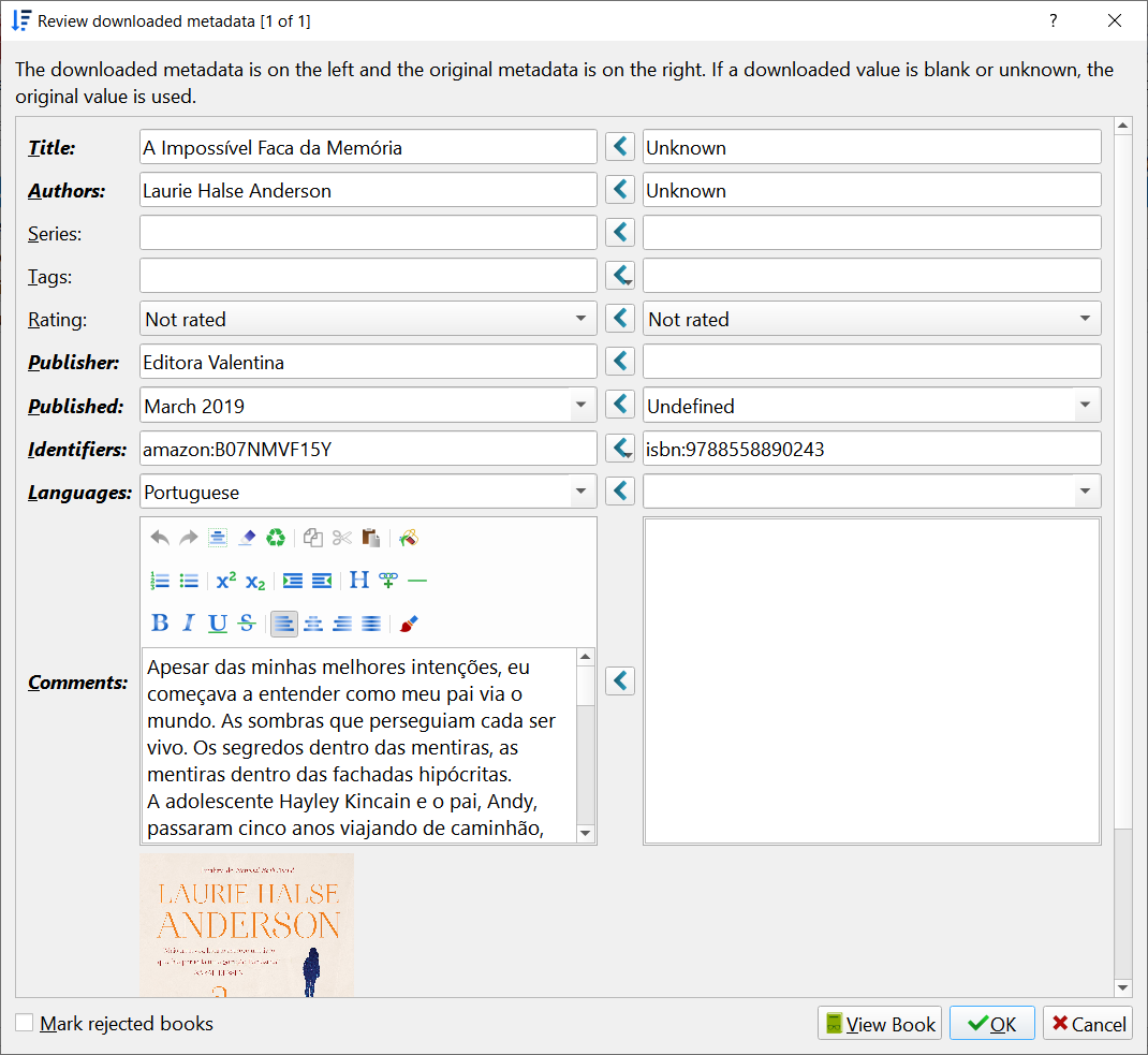 9788 is not an English ISBN (as the MDE view shows: Portuguese ) This may be a Metadata plugin configuration issue. Yours must accept a broader lookup scope. (English language books are 9780 or 9781 ) |