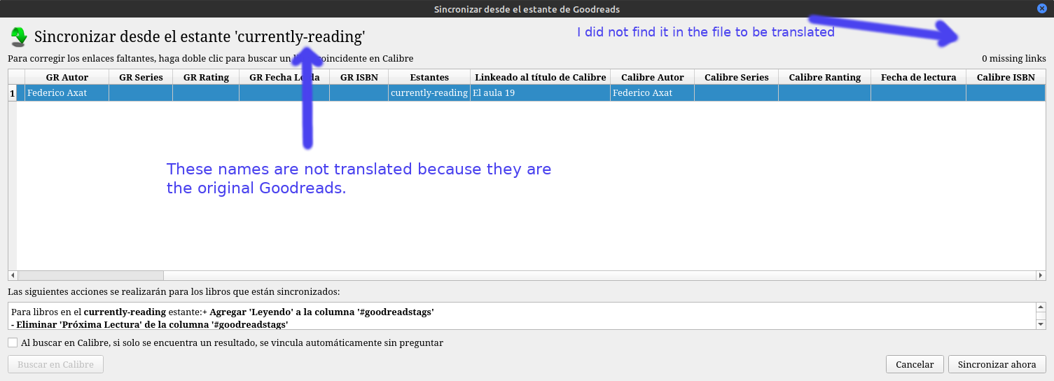 Thanks to @dunhill, the Goodreads Sync plugin has been translated to Spanish. The attached beta includes this. Unless I missed something, it should have all the strings translated.  If anyone sees any issues, please tell me. If there aren't any, I will release it in the next few days. |
