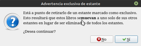 #: dialogs.py:1695 msgid "" "You are about to remove from a shelf marked as exclusive. This will result" "in these books being <b> moved </b> to one of your other shelves rather than" "being deleted from all shelves. <p> Do you want to continue?" msgstr "" "Está a punto de retirarlo de un estante marcado como exclusivo. Esto resultará " "que estos libros se <b>muevan</b> a uno solo de sus otros estantes en lugar de " "ser eliminados de todos los estantes.<p>¿Desea continuar?" So that it does not look like in the last image. The first two images the string is in the core.py file that is also not included in the .po file If there is any way to manage an updated .po file or any way to do it, do not hesitate to let me know. |
