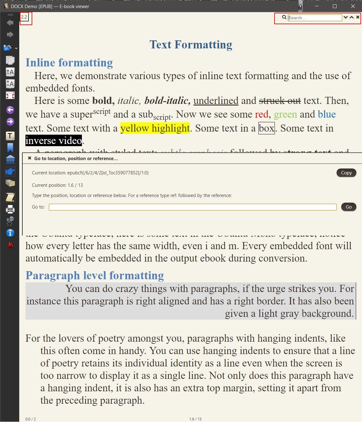 Similarly with Reference numbers, when toggled on, they will display at top right of current paragraph, and there's a Go to panel into which you can type reference numbers - Ctrl+G will pop it Maybe there could be toolbar buttons for Start Search and Go To. BR |