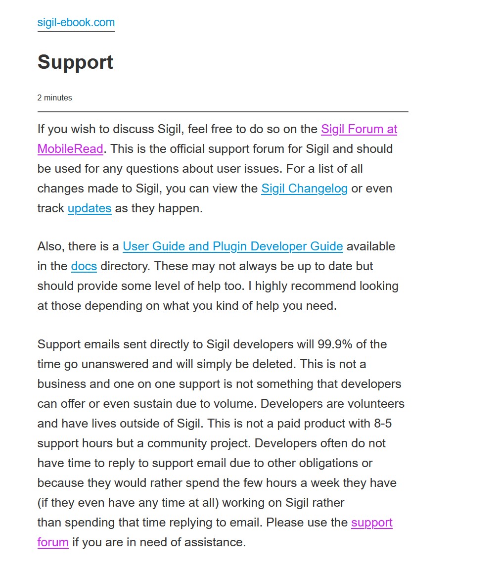 I have some website feedback. For me at least, on reading the website, I cannot see the difference between text and linked text. May it be considered to make any inline link bold and a color in contrast to the main website text. I attached a slide on how I see the support page, see how 'Sigil Forum at MobileRead' is linked yet looks quite identical to all the other text. Thanks, Mike |