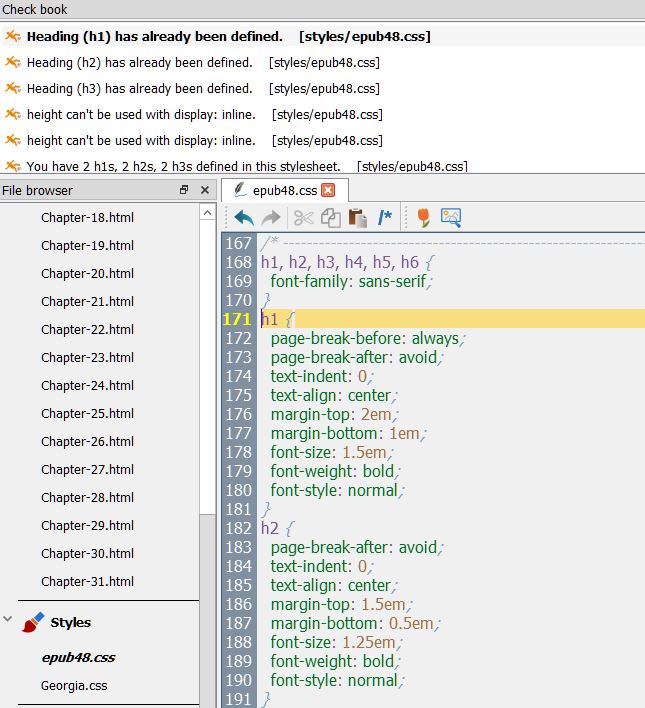 https://github.com/CSSLint/csslint/w...e-defined-once ... very odd. I don't agree with that at all. I can understand Check Book pointing out an (accidental) duplicate in your CSS: h1, h2, h3, h4 { } h2 { } h2 { } but pointing out ones that aren't the same? h2 h2.title h2.author No. I'll have to agree with phossler and hobnail on this one. Sometimes it's easier to have a centralized location for shared CSS, and then specific overrides in a different location. Side Note: And I would strongly recommend against adding hyphens: none though. Think big words ("Acknowledgements"), with big font, on tiny devices (cell phone). Just leave that setting up to user devices/preferences. Last edited by Tex2002ans; 01-24-2020 at 10:18 PM. |